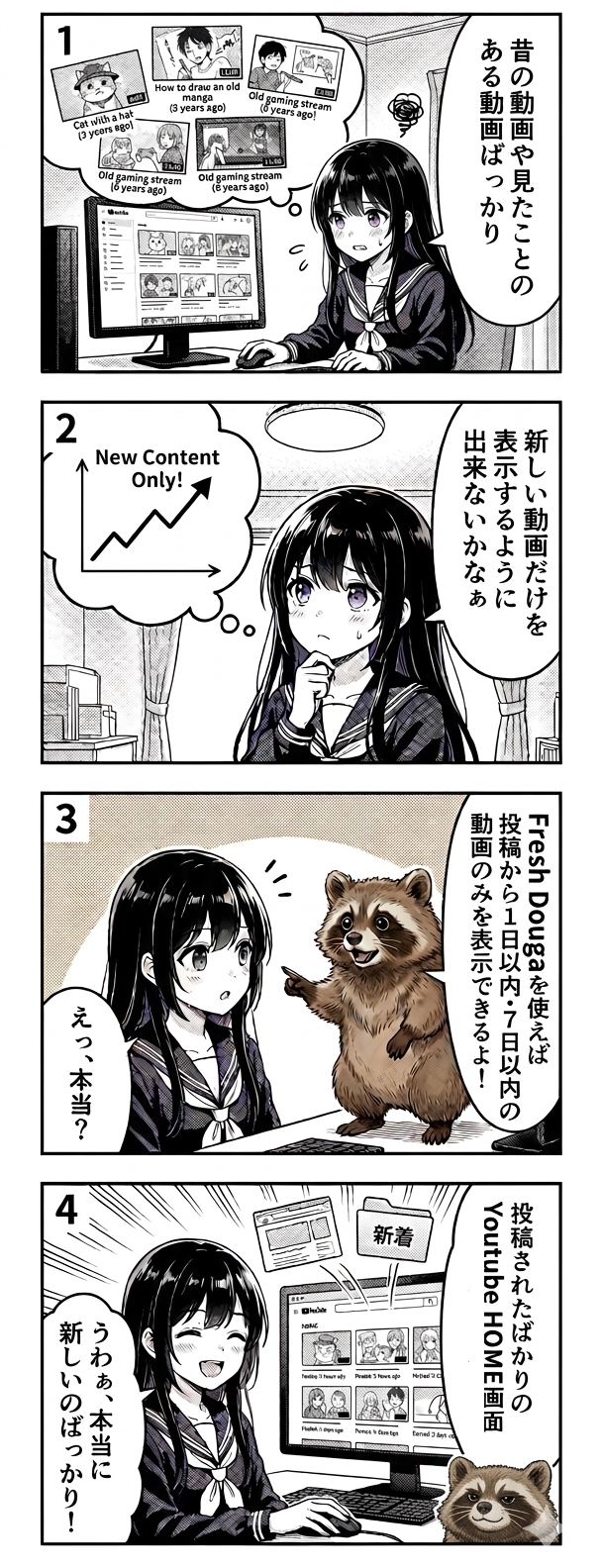 「Fresh Douga」は、YouTubeの推薦アルゴリズムを否定することなく、「鮮度」というフィルターをレイヤーとして重ねることで、ユーザーが直感的に新しい動画だけを探索できるようにする拡張機能です。